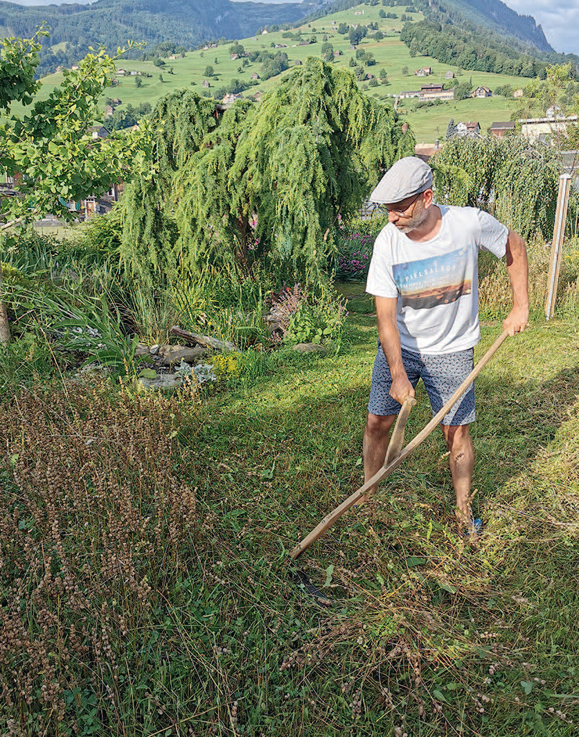 Oje, das ist in etwa so, wie wenn man Eltern fragt, ob sie ein Lieblingskind haben. Am liebsten entdecke ich den Garten und schaue an verschiedenen Orten, wie er sich entwickelt. Ich bleibe nicht an einem speziellen Platz hängen. Lustwandeln, also ein Spazieren ohne Ziel und Zeitdruck, beschreibt diese Tätigkeit wohl am besten. Wenn ich nun aber nur einen Lieblingsplatz auswählen sollte, ist es die Terrasse beim Haus. Dort kann ich am Gartentisch sitzen und einen Blick in die verschiedenen Bereiche des (fast) ganzen Gartens werfen. Das wäre dann wohl so etwas wie «Lustwandeln für die Augen». Ich kann von dort auch den Vögeln zuhören und die Insekten über der Wiese fliegen sehen. Außerdem sind die Terrassenfugen der Lieblingsort für mancherlei Pflanzensamen, den sie sich als Aussaatbeet auswählen. Ich entdecke dort immer wieder selbst versamte Schätze. Das finde ich faszinierend.