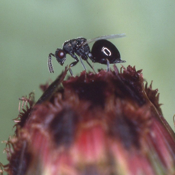 Meine Lieblingsfamilie sind die Platygastridae. Diese mehrheitlich zwei bis drei Millimeter kleinen Wespen sind wichtige natürliche Feinde von Gallmücken und als solche nur dem Spezialisten oder der Spezialistin bekannt. Sie verfügen über spezielle körperliche Merkmale wie einen stark verlängerten Hinterleib oder ein «Horn» auf dem Rücken, in dem der mehr als körperlange Legebohrer in Ruhelage untergebracht ist. Es existieren nur wenige fotografische Dokumente zu ihrem Verhalten, das mich immer wieder fasziniert: Wie gelingt es ihnen, die ins Pflanzeninnere abgelegten, von Auge kaum sichtbaren Eier ihrer Wirte zu finden und mit ihren noch viel kleineren Eiern zu belegen? Es handelt sich im wahrsten Sinn um eine mikrochirurgische Meisterleistung.