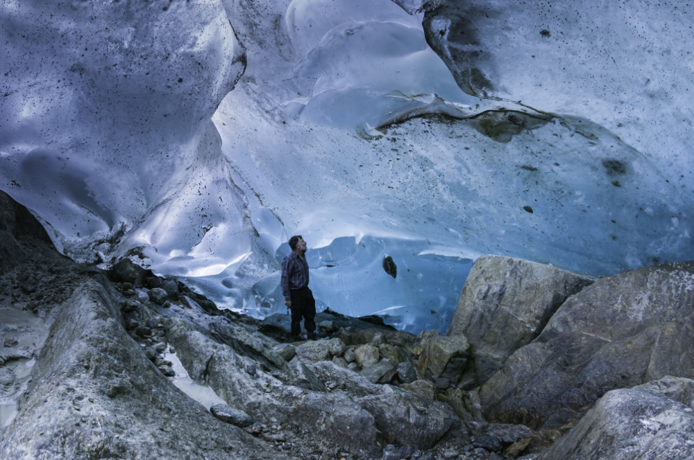 In einer Eishöhle unter dem Rand des Grossen Aletschgletschers lässt sich beobachten, wie das Gletschereis von rechts nach links über einen Felsvorsprung schrammt. Im Eis eingeschlossene Gesteinstrümmer wie derjenige vor der Person verstärken die Erosionswirkung des Gletschers.