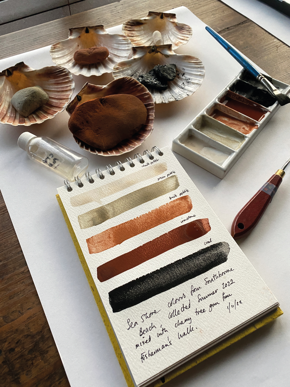 I started making natural colours from earth as a young child playing in the garden with mud pies and brightly coloured berries such as blackberries, fuchsia berries and the petals of flowers like roses, marigolds and nasturtiums. It was many years before I was able to make them more seriously (but with still much enjoyment) in 2016 at courses with Daniel Chatto The Royal Drawing School in London. Since then I have been researching and refining methods and recipes in my own studio practice.