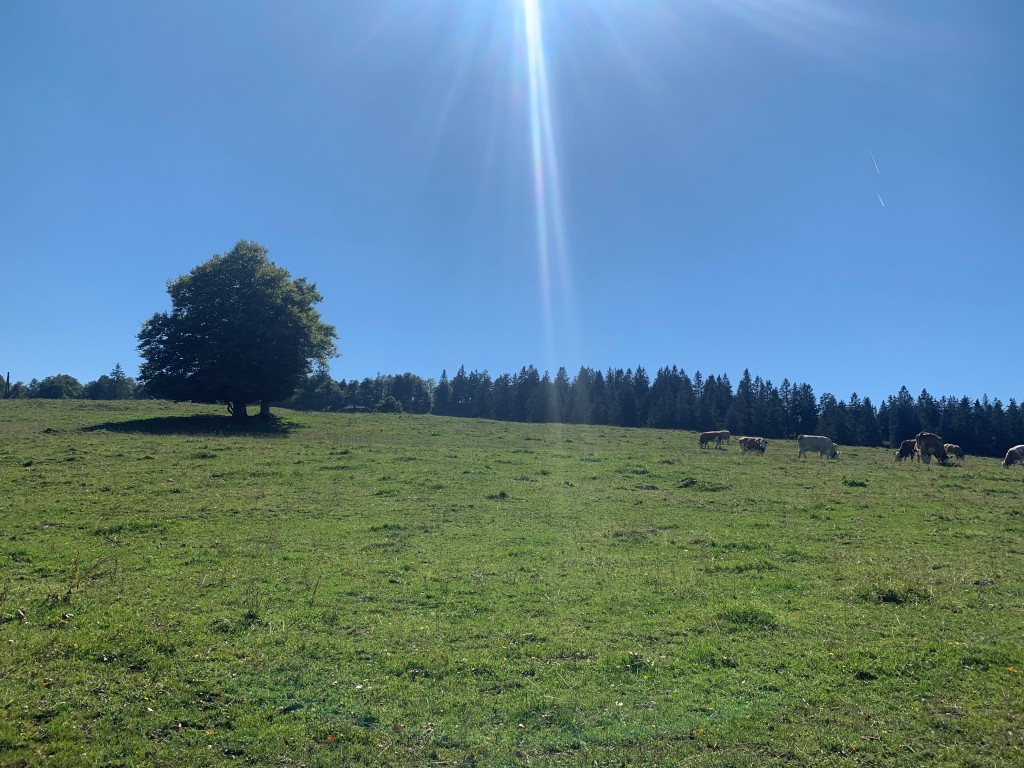 La Heutte, das kleine Dorf am Südfuß des Montoz ist der Ausgangspunkt unserer Wanderung. Das erste Ziel ist rund 600 Höhenmeter später die Métairie de Werdtberg auf dem Jurakamm. Die Zeitangaben auf den Wegweisern zeigen bis dahin zwei Stunden Gehzeit an, doch das ist, wie Daniel Roth auch anmerkt, sehr großzügig bemessen. Oben angekommen, lässt sich bei klarer Sicht ein Picknick mit Blick auf die Berner Viertausender genießen. Wir hatten Glück mit dem Wetter und haben das dann auch getan. Die meisten Höhenmeter sind nun geschafft und wir wandern für die nächsten drei Stunden weiter ostwärts über Juraweiden, vorbei an Einzelbäumen oder Baumgruppen. Der Blick schweift dabei immer mal wieder nach rechts zu Eiger, Mönch, Jungfrau und deren Nachbarbergen.