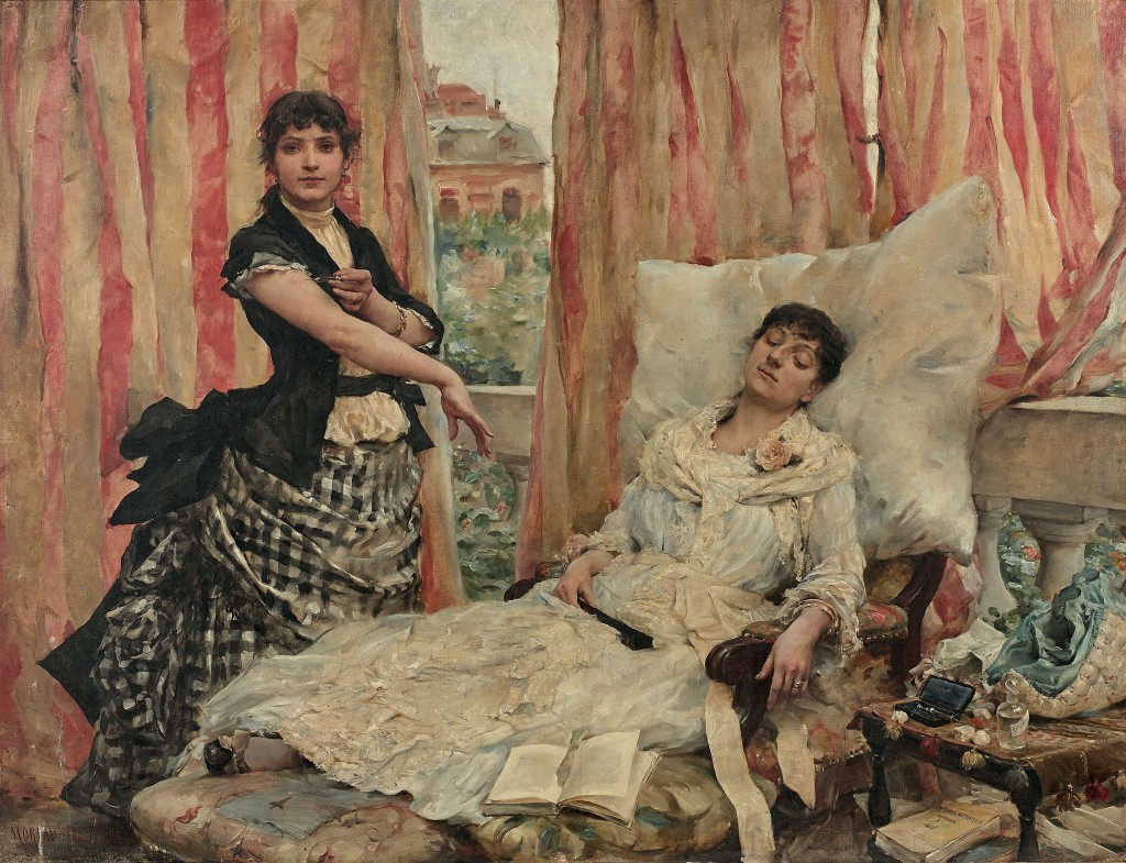Das Gemälde Les Morphinées von Georges Moreau de Tours zeigt zwei Frauen, die Morphium zur Schmerzlinderung einnehmen. Damals suchte man verstärkt nach Wegen, sich die Heilkraft von Pflanzen zunutze zu machen. Im Jahr 1804 wurde Morphin als erster Wirkstoff aus einer Pflanze isoliert, und mit der Einführung der Injektionsnadel verbreitete sich seine Verwendung als Schmerzmittel rasant. ©Wikipedia