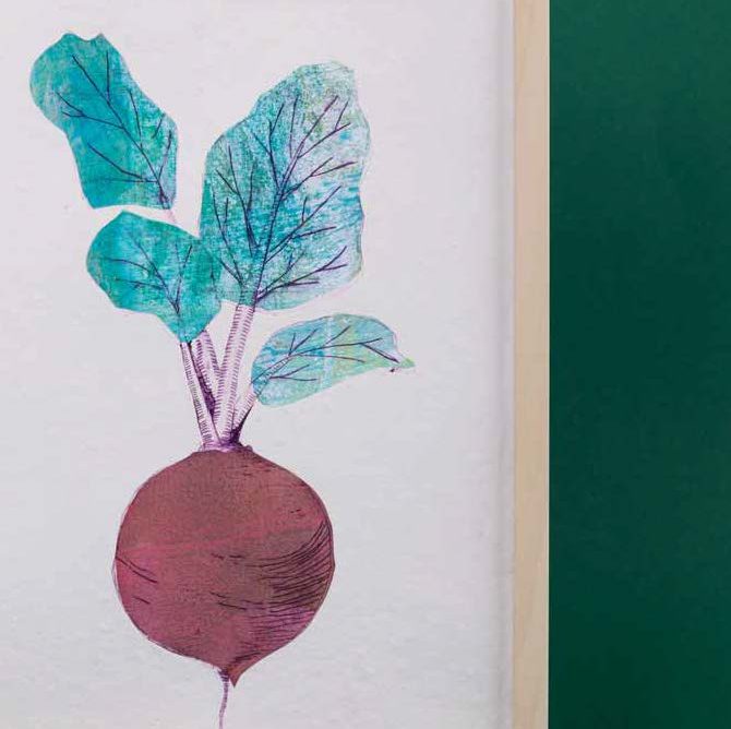 Bei der Chine-collé-Technik wird ein Stück dünnes einfarbiges oder gemustertes Papier auf die Druckplatte gelegt und beim Drucken auf das Druckpapier geklebt. Der Abzug erhält so mehr Textur. Experimentieren Sie mit verschiedenen Papieren, z. B. selbst bemalten Bogen oder Seiten aus alten Büchern oder Zeitschriften.
