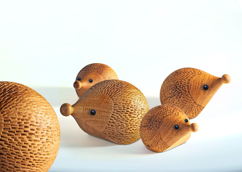 Interpretation des Stachelkleids von Igeln mit flächig angelegten, schrägen Prägungen. Die Igelfiguren wurden kurz vor dem Prägen geölt, um die spröden Eichenfasern geschmeidiger zu machen.