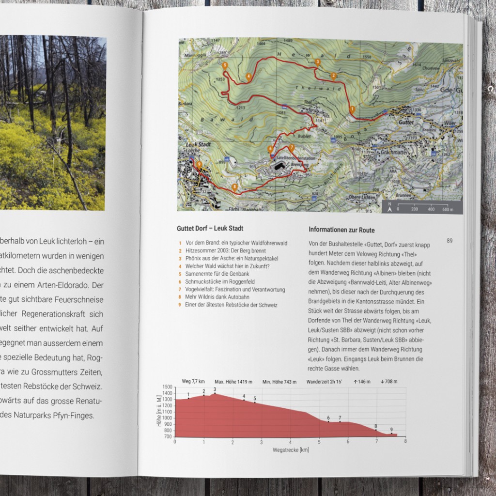 Vier der Wanderungen führen durch den Naturpark Pfyn-Finges. Seine zentrale Lage im Wanderführer versinnbildlicht die Bedeutung für die Region. Wer das Wallis schätzt, sich für Neues interessiert und gerne zu Fuss in der Natur unterwegs ist, der wird an diesem speziellen Wanderführer seine Freude haben.