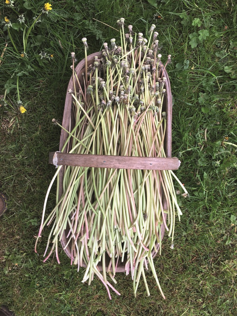 Löwenzahn (Taraxacum officinale) wird nach der Blüte geerntet – idealerweise nachdem sich die Samen verbreitet haben (Blüten und Samen sind für eine Vielzahl von Wildtieren und Insekten wertvoll). Dann können die Stängel gepflückt und getrocknet werden. Wählen Sie nur lange Stängel, sie wachsen oft zwischen hohen Gräsern.
