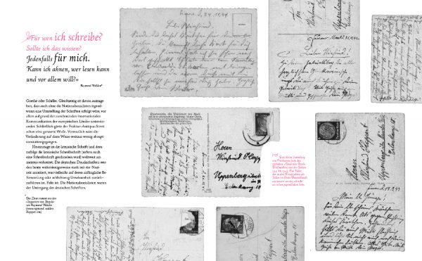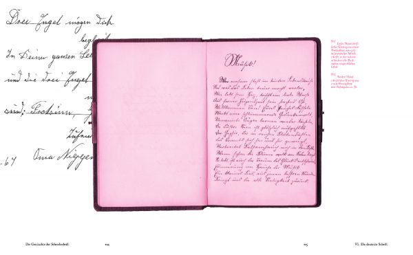 Bereits vor etlichen Jahren fand ich ein wunderschönes, kleines Poesiealbum auf einem Trödelmarkt. Es enthält absolut fantastische Handschriften vom Beginn des 20. Jahrhunderts. Doch obwohl die Einträge in Deutsch geschrieben sind, konnte ich sie nicht lesen. Das war meine erste Begegnung mit der deutschen Schreibschrift, von der ich bis dato noch nie gehört hatte. Diese Begebenheit begleitete mich auch in meinem Designstudium in dem ich mich näher mit Schriften allgemein und Schreibschriften im Besonderen beschäftigte. Das gab den Anstoß zu diesem Buch.