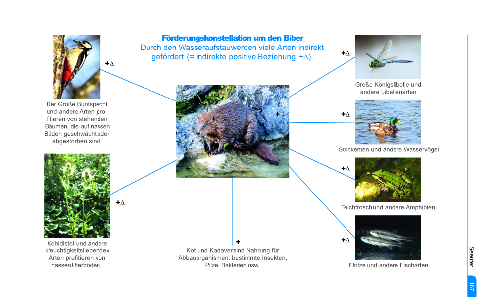 Der Biber fällt bekanntlich große Laubbäume (auch Obstbäume) und schafft so Platz und Licht, sodass bestimmte Pflanzen- und Tierarten neue Lebensräume erhalten. Sind die Wurzeln von Bäumen über längere Zeit unter Wasser, so sterben sie ab. Stehende geschwächte oder tote Bäume bieten dann z. B. Greifvögeln Ansitzwarten, Spechte und andere Vögel können dort ihre Höhlen bauen und Totholz bewohnende Insekten wie bestimmte Wildbienen erhalten Nistmöglichkeiten. Man kann also sagen, dass die Biodiversität in und entlang von Biberteichen zunimmt; allerdings gibt es natürlich auch Arten, die durch den Wasseraufstau beeinträchtigt werden, z. B. bestimmte Bodenorganismen und «trockenheitsliebende» Pflanzen. Einige der erwähnten indirekten positiven Beziehungen des Bibers zeigt die folgende Förderungskonstellation.